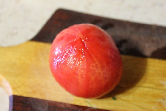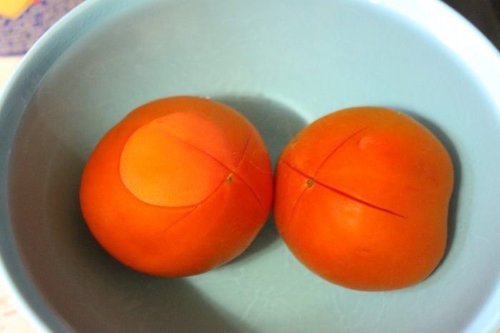 Помидор сверху надрезать крест-на крест. Залить кипятком на 2 минуты.