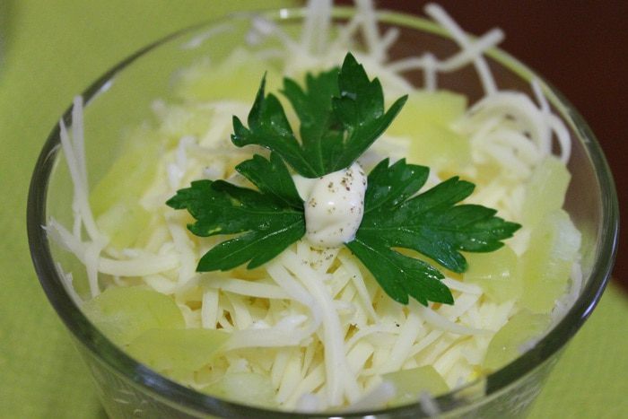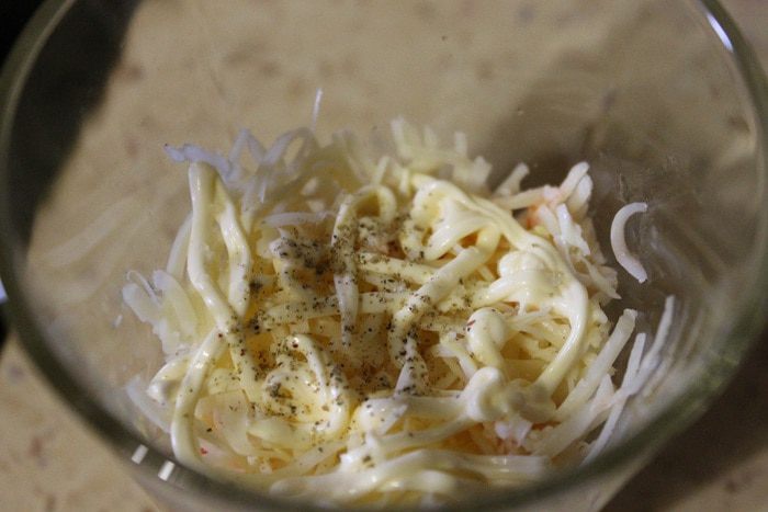 Затем слой сыра, майонез и перец.