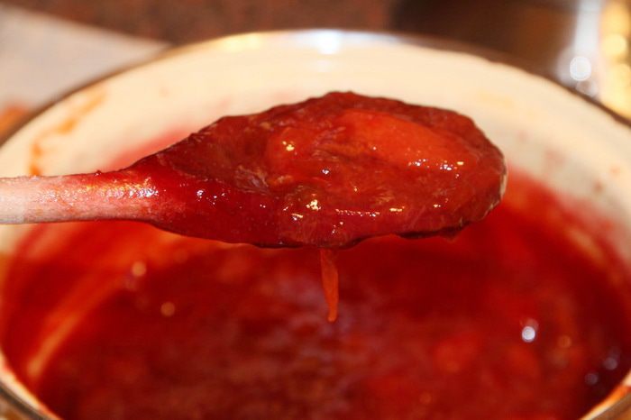 Горячий конфитюр раскладываем по стерилизованным баночкам, оставляем без крышки остывать до холодного. Когда конфитюр остынет, на поверхности образуется "мармеладная" пленочка. Закатываем крышками холодный конфитюр. Первый раз может и не получится ОЧЕНЬ густой продукт, но вы все-равно поймете процессы, которые происходят при готовке таким образом: образуется достаточно много пектина, желеобразующей составляющей. Поэтому я и написала, что чем кислее слива, тем лучше. Конфитюр получается кисло-сладким. У меня выход: две пол-литровые баночки и одна 125 мл. Смачного! Будут вопросы - спрашивайте!