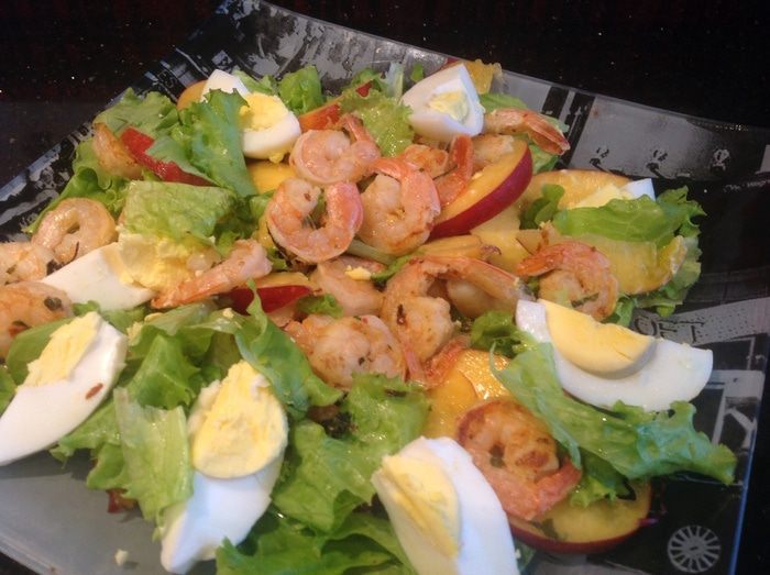 Выложите в салат жареные креветки и яйца, разрезанные на четвертинки. Сбрызните оставшейся заправкой и подавайте. Приятного аппетита!!!