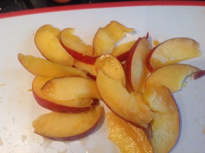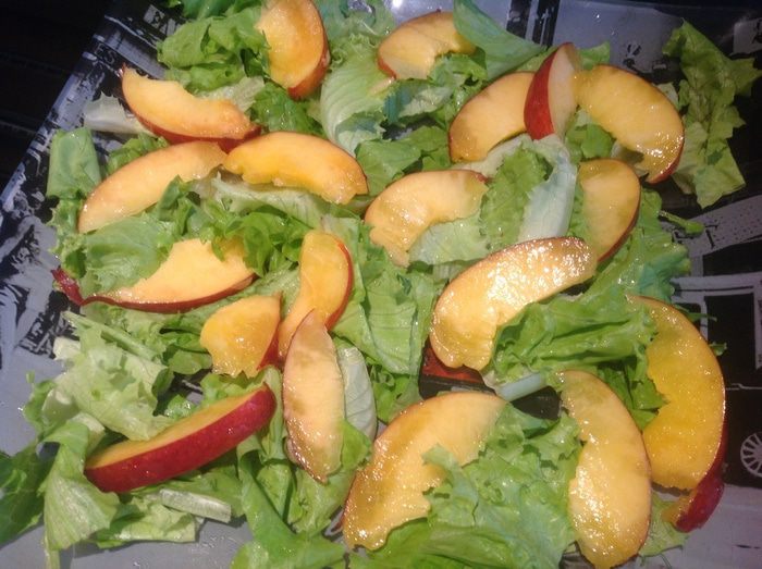 Листья салата вымойте, обсушите бумажным полотенцем, порвите, выложите на блюдо. Сверху выложите нектарины.