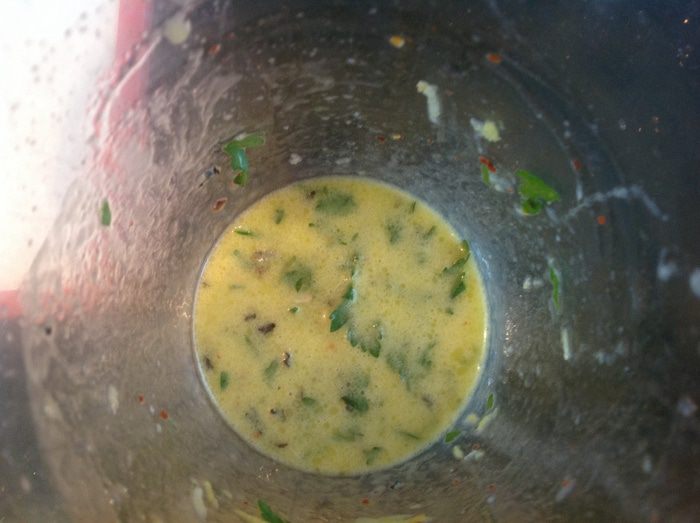 Соедините цедру и сок лимона, 3 ст. л. оливкового масла, 1/3 стакана измельченого базилика, соль и перец, взбейте блендером.