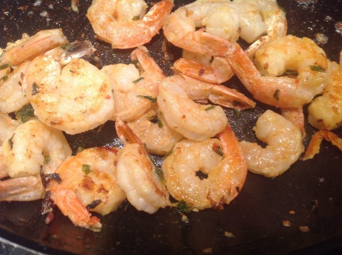 1 ст. л. заправки оставьте, остальное добавьте в чашу с креветками, тщательно перемешайте и маринуйте 20 минут.