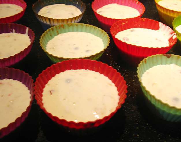 Разложить по формочкам и сверху разложить оставшуюся смородину. Выпекать в предварительно разогретой до 160 градусов духовке 15 минут.