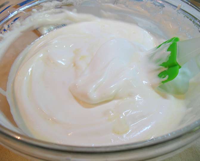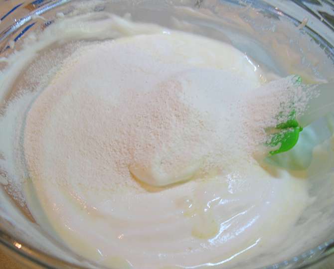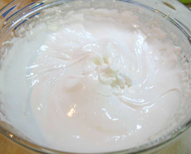 Взбить белки до пены, постепенно добавляя сахарную пудру взбивать до мягких пиков.