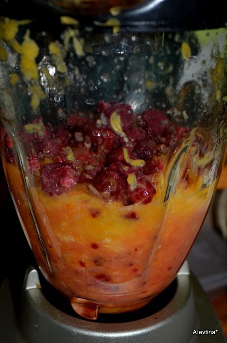 Выложить все в блендер. Добавить малину,клубнику или ежевику, сок одного лимона, апельсиновый сок и взбить до однородной массы. Разлить по высоким стаканам.