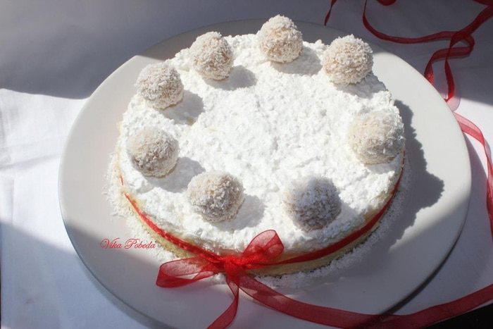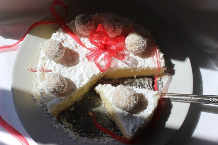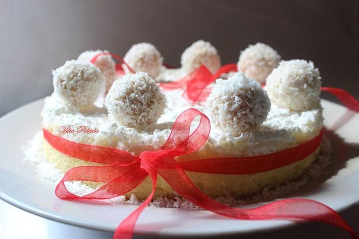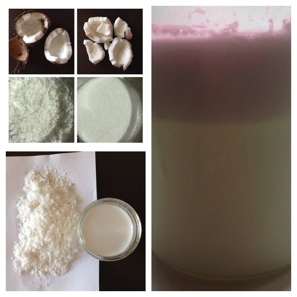 Натрем кокос на терку, я тру в комбайне. В это время греем воду. Заливаем тертый кокос кипятком так, чтобы вода полностью покрыла тертую массу. Обычно у меня на это уходит 2 стакана. Даем массе настояться и остыть. При помощи блендера тщательно все перетираем. При помощи марли отжимаем жидкость и получаем в среднем 500 мл кокосового молока со сливками. Чтобы получить сливки нужно жидкости дать постоять в холодильнике. Сливки всплывут на поверхность. Они то нам и нужны для рецепта.