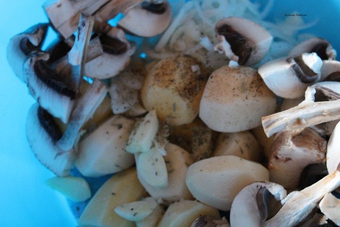 Для гарнира лук нарезать полукольцами, чеснок на половинки, грибы ломтиками, добавить картофель, специи и сметану. Хорошо все перемешать. Выложить в смазанную маслом форму (1 ст.л.) и отправить в духовку к голеням. Запекать до золотистого цвета картошечки, один раз нужно перемешать.