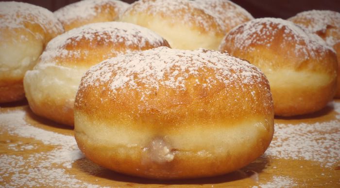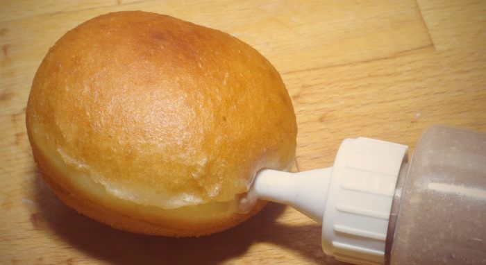 Жарим пончики во фритюре, на среднем огне. Глубина масла должна быть не менее 5 см. Пончики очень быстро увеличиваются в размере при жарке, а внутри образуется полость, очень удобная для заполнения начинкой. Очень важно жарить именно на среднем огне, иначе, при большой температуре, верх пончиков подрумянивается, а середина остаётся недопечённой.