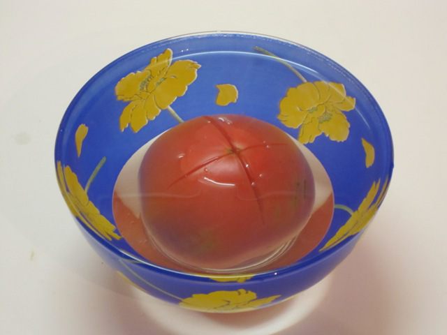 Помидор надрезать крестообразно, залить кипятком. Оставить на 3 минуты, затем опустить в холодную воду. Снять кожицу.