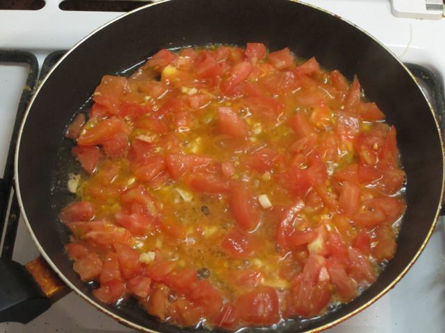 Зубчики чеснока нарезать, обжарить на растительном масле. Добавить нарезанный помидор, обжарить до выпаривания жидкости.