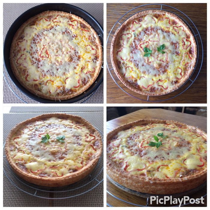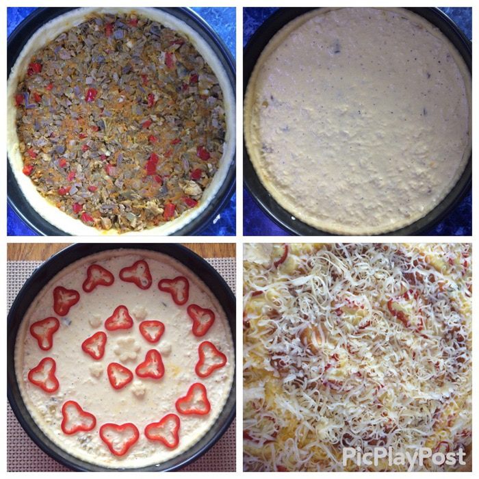 Выкладываем остывшую начинку. Равномерно сверху распределяем заливку, укладываем дольки болгарского перца и отправляем в разогретую духовку до 180°С выпекаться на 30-40 минут, время зависит от вашей духовки. Минут за 5 до окончания выпекания посыпаем киш сверху оставшимся сыром и допекаем его.