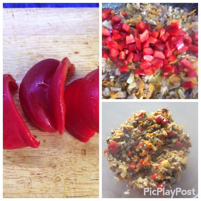 Нарезаем кубиком болгарский перец (у меня гогошар замороженный) и отправляем к начинке. Тушим еще пару минут и выкладываем начинку в миску, чтобы она остыла.