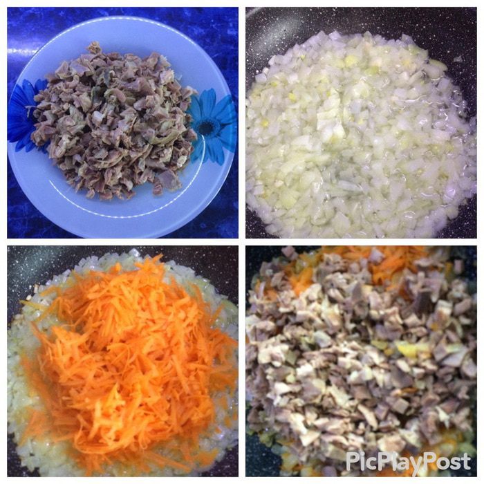 Нарезаем мясо курицы кусочками. На подсолнечном масле жарим лук, добавляем тертую морковь, тушим. Затем добавляем мясо курицы и несколько ложек бульона, солим перчим по вкусу.