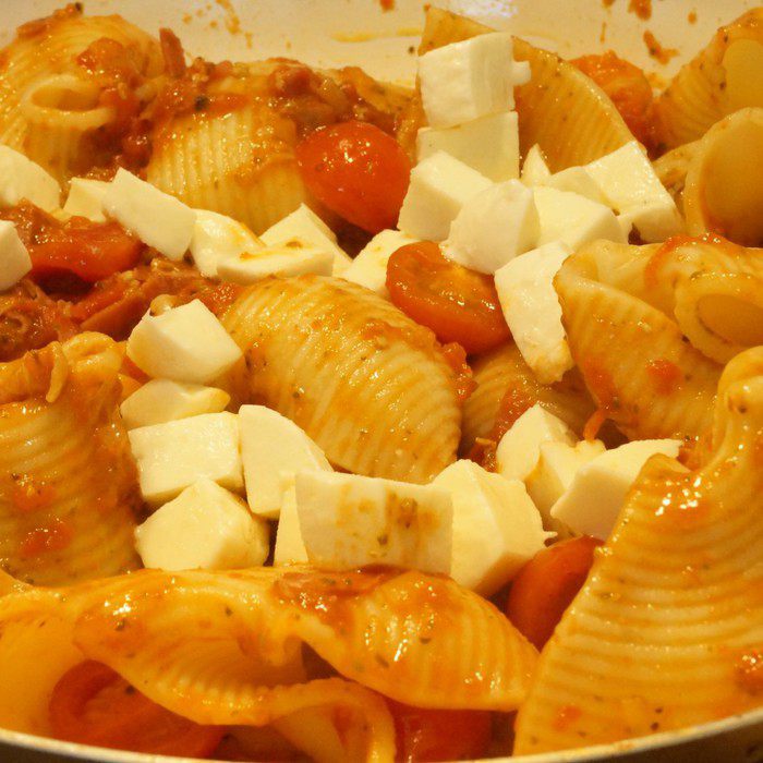 В ступке по очереди растираем листья базилика (5 шт)+соль, добавляем еще листья, кладем чеснок, когда он размягчится, добавляем орехи, в конце кладем сыр и масло. Соус тщательно перемешиваем.
