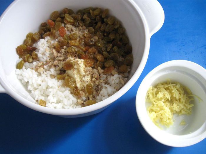 Имбирь почистить, натереть на крупной терке. Изюм замочить в кипятке на несколько минут, откинуть на сито, просушить. Для фарша смешать рис, третью часть сливочного масла, изюм, имбирь, растолченные в ступке орехи. Посолить, поперчить.