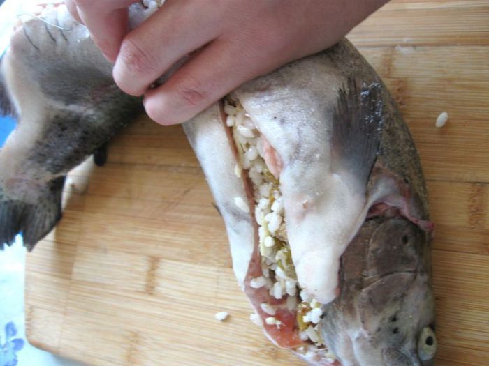 Наполнить брюшко рыбы этой массой.