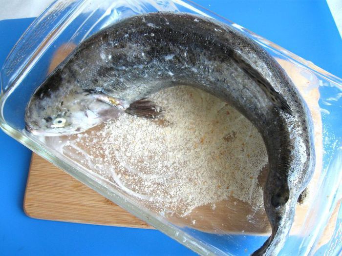 Выложить форель на смазанный маслом (третья часть) и посыпанный сухарями противень или в форму с низкими бортами.