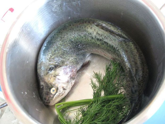 Форель помыть, снять чешую, удалить жабры, выпотрошить. Помыть снаружи и изнутри. Промокнуть полотенцем или салфеткой. Чтобы она приобрела нужную форму, отправила ее в холодильник на сутки в кастрюле подходящего диаметра, чтобы она приобрела выгнутую форму (кастрюля с толстым дном).