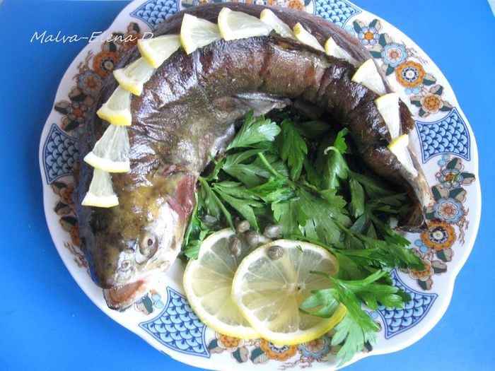 Хочу познакомить вас с рецептом блюда из Армении. Праздничный стол редко обходится без парадного рыбного (из сига, осетра или форели) блюда. Озеро Севан славится очень вкусной форелью, здесь ее называют ишхан. В армянской кухне много блюд из нее: Ишхан хашац (тушеная форель), Ишхан хоровац (форель на вертеле), Ишхан в вине, «Плаки» (из припущенной форели).