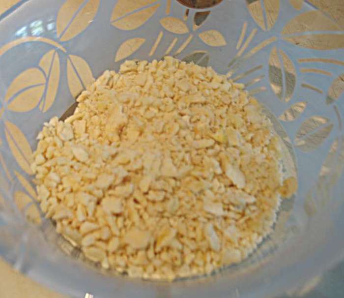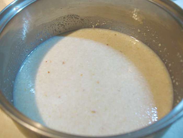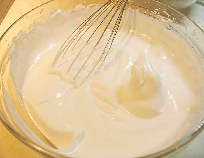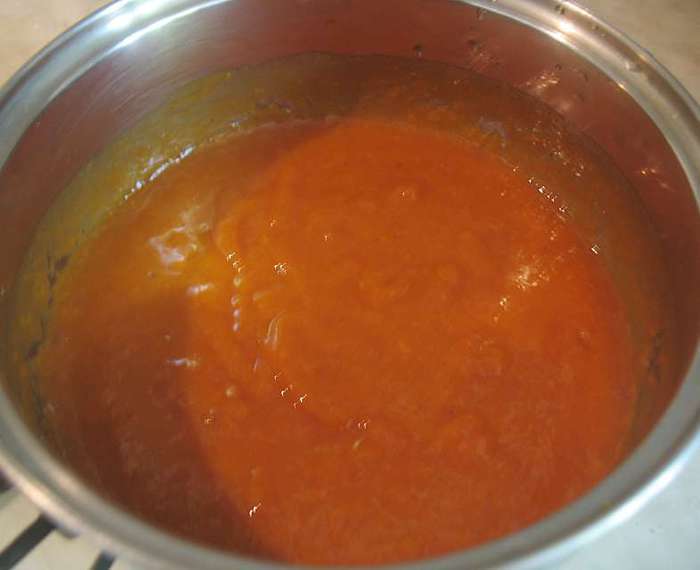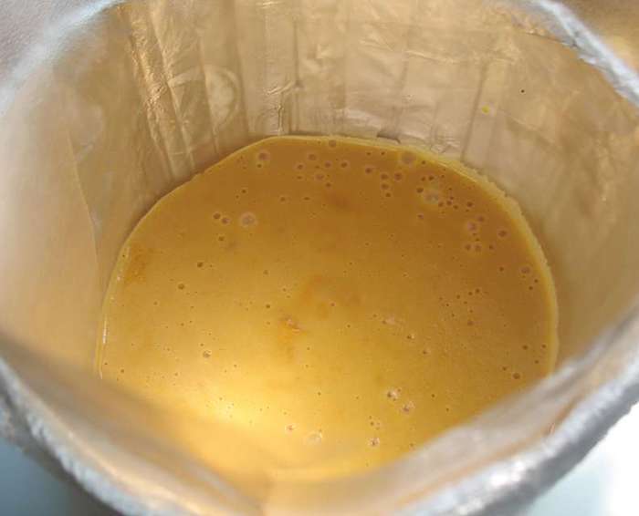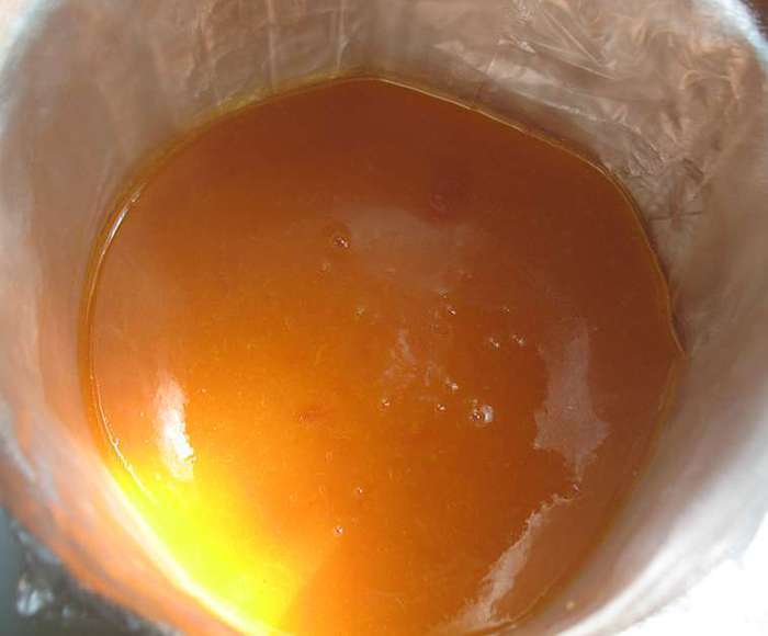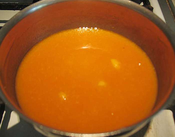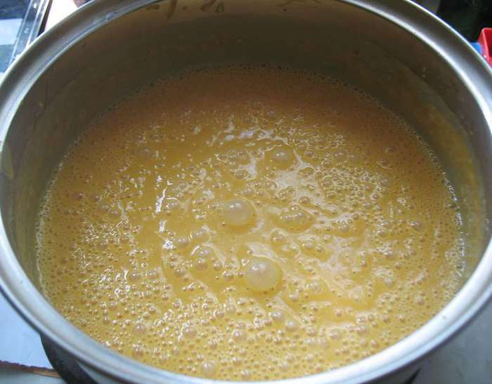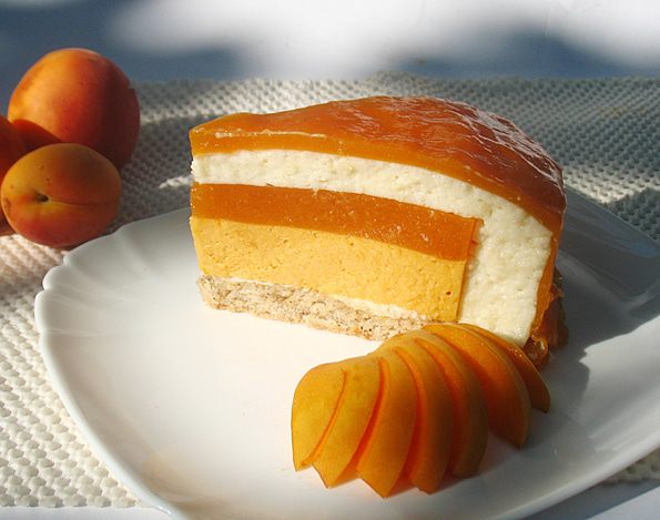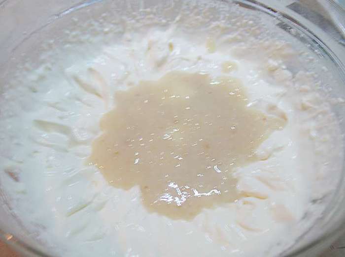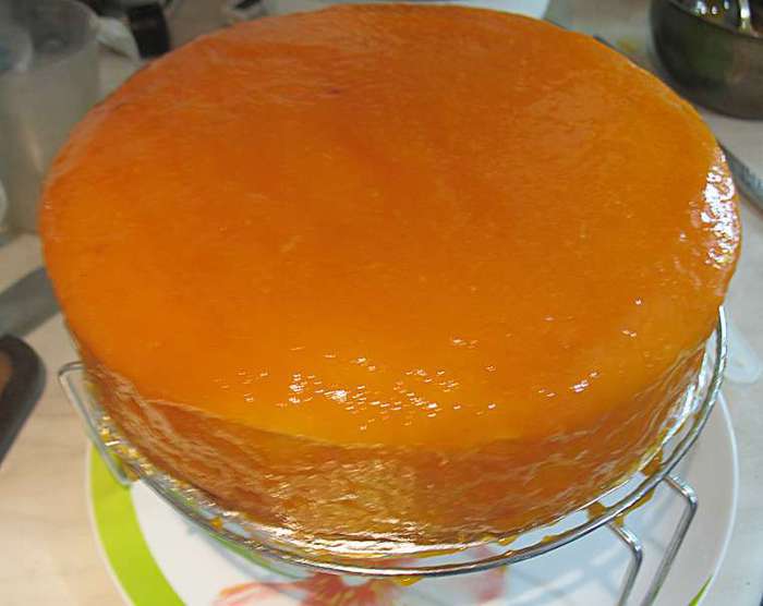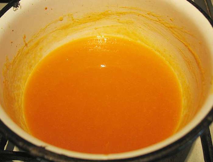 В кастрюльке смешать абрикосовое пюре, сахар, яйца, желтки, ванильный сахар. Перемешиваем и ставим на огонь. Прогреваем до 85 градусов (появятся редкие бульбашки и пойдет пар). Добавляем желатин, растворяем его и снимаем с огня. Охлаждаем до теплого состояния.