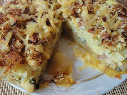 8. Выстелите бумагой для выпечки круглую разъемную форму, смажьте оставшимся сливочным маслом, высыпьте на нее миндаль и уложите слоями половину картофеля.
