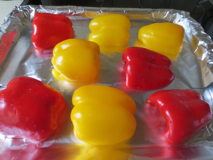 Перец разрезаем пополам, удаляем сердцевину, кожей наружу выкладываем на застеленный фольгой противень.