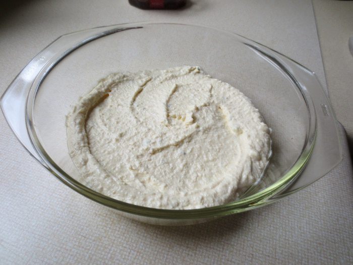 Смешиваем сыр рикотта, сливки,тертый пармезан, яйца, 2 ст.л. масла из вяленых томатов, чеснок, мука, перец, соль и выливаем в форму для запекания.