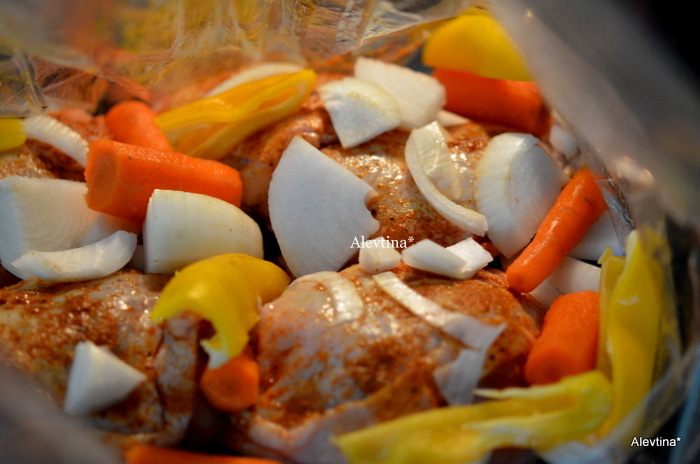 Добавить куриные бедрышки и овощи в пакет.