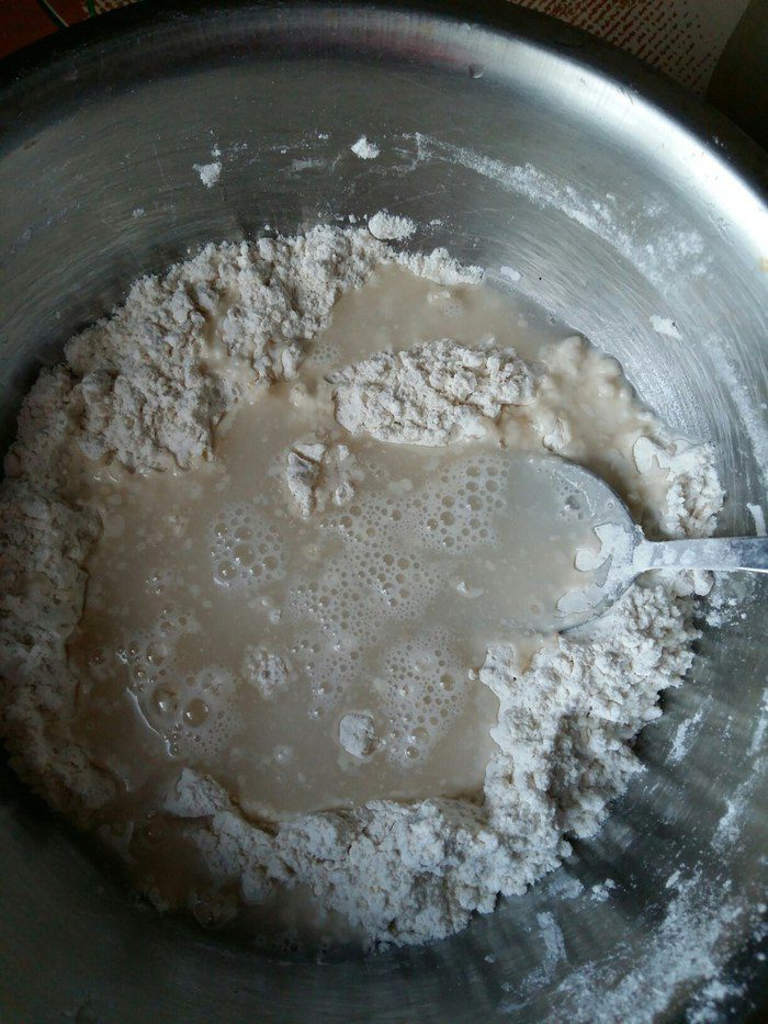 В сухую смесь добавить растительное масло и теплую воду.