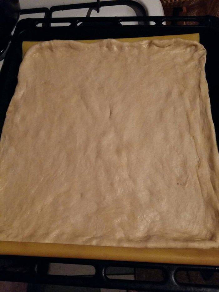 Я использую силиконовый коврик, очень удобно, коврик положить на противень, руками тесто растянуть по его размерам.
