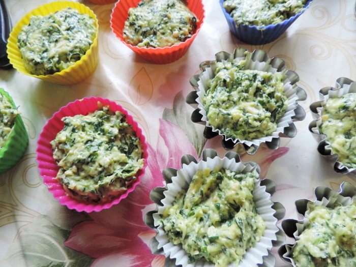 Соединяем измельченный шпинат, сыр, тертые кабачки с творожно-яичной массой. добавляем измельченные укроп и петрушку (у меня было 30г зелени, петрушки примерно в два раза меньше укропа ). Перемешиваем. Всыпаем муку, а сверху разрыхлитель (пакетик рассчитанный на 0,5кг муки). Перемешиваем до получения однородного теста.