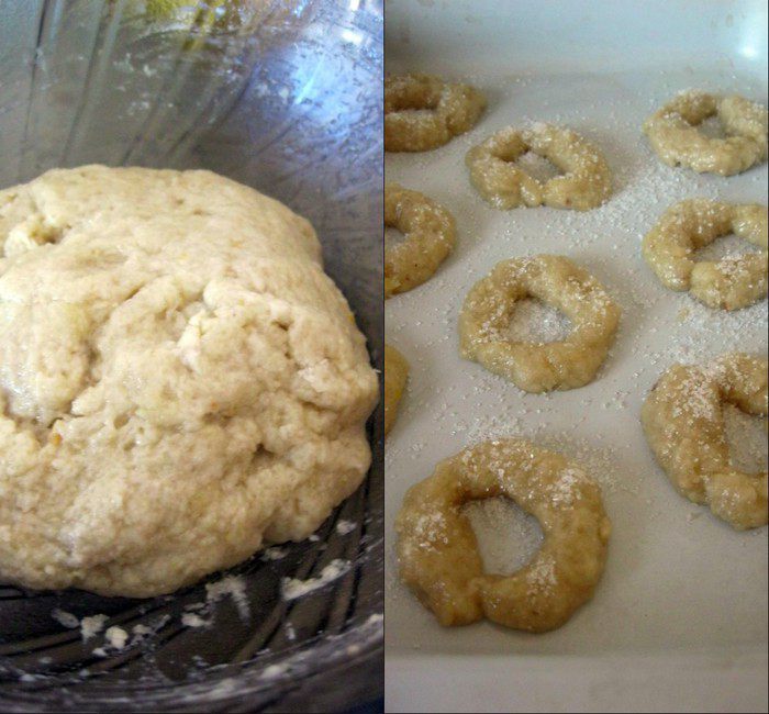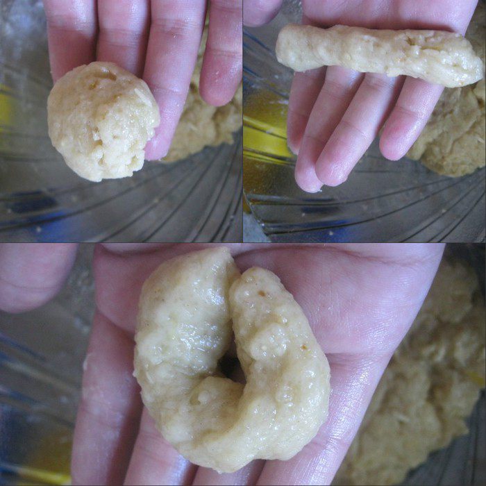 Для формирования печенек - отщипывать небольшие кусочки от основного теста. Скатать в колбаску. Сформировать колечки, соединив концы.