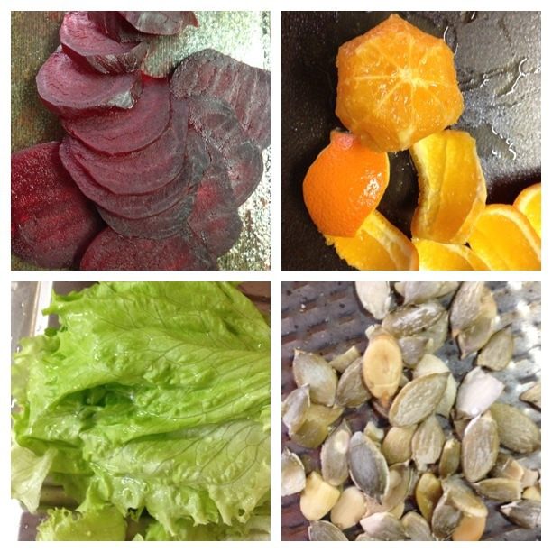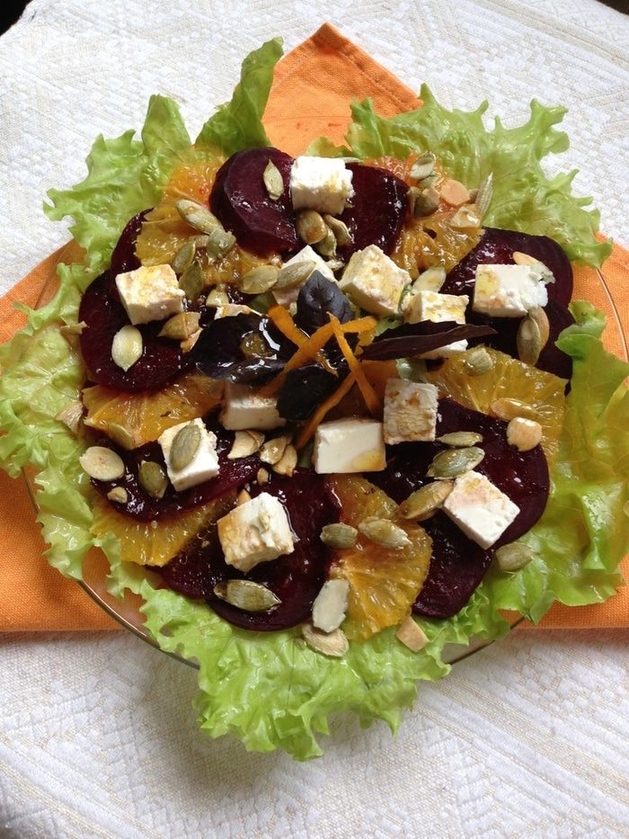 На порционную тарелку выкладываем салатные листья, кружочки свеклы и апельсина, чередуя их в произвольном порядке. Сверху кладем порезанный кубиками сыр, посыпаем семечками и поливаем заправкой. Украшаем по желанию, у меня веточка фиолетового базилика и апельсиновая цедра.