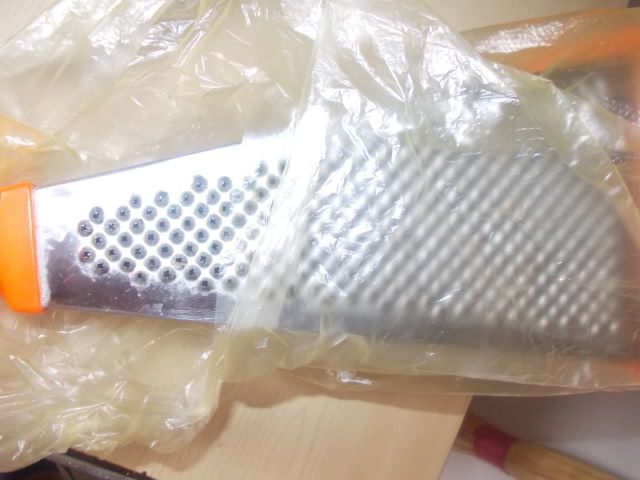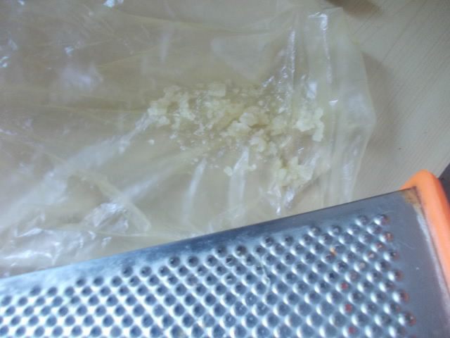 Нам нужно чесночное пюре. Может кто-то не знает этого,но чтобы не забивалось отверстия терки, нужно просто надеть на нее пакет.
