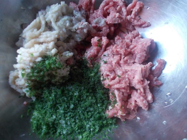 Половину булочки замочить в молоке,или воде,помолоть вместе с луком добавить к фаршу и шпинату.Посолить и поперчить.