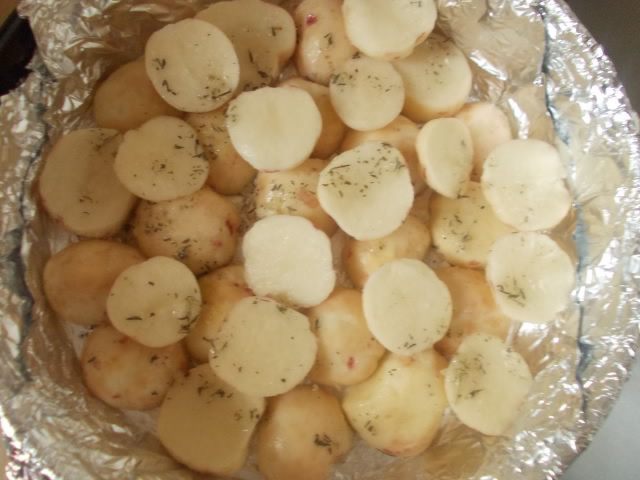 В форму для запекания укладываем картофель порезанный кольцами.Поливаем ароматным маслом.