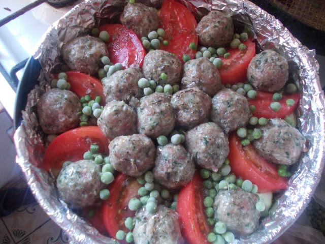 Сверху укладываем тефтельки,помидоры дольками и зеленый горошек,не забываем каждый слой полить маслом с травами. Ставим на 45-50минут в духовку 180С.Первые 20 минут накрыть верх фольгой,затем снять.