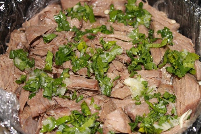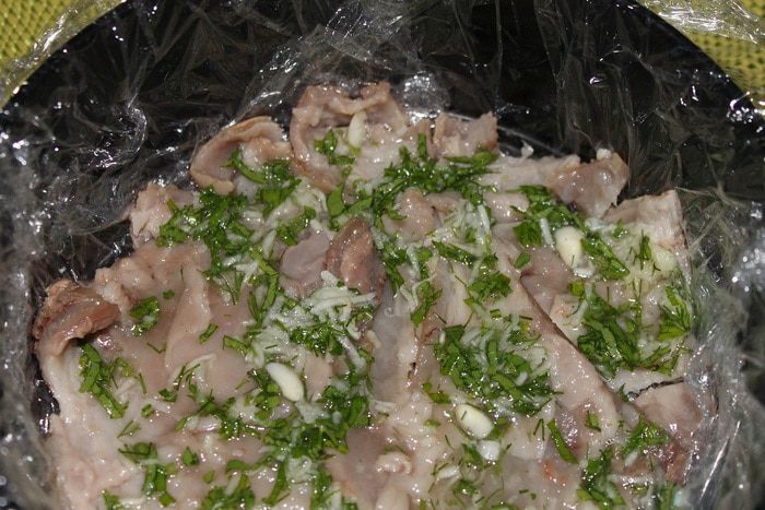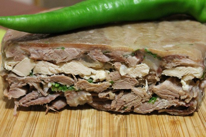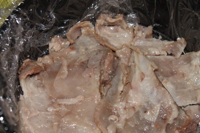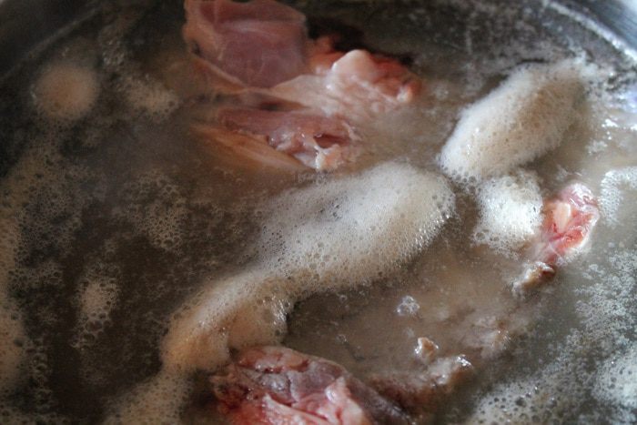 Берем кастрюлю 5л. Кладем в нее хорошо вымытую свиную голень и говядину. Заливаем холодной водой и ставим на огонь. Когда закипит, проварить 5 минут, достать мясо, воду с пеной вылить.