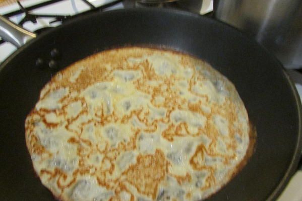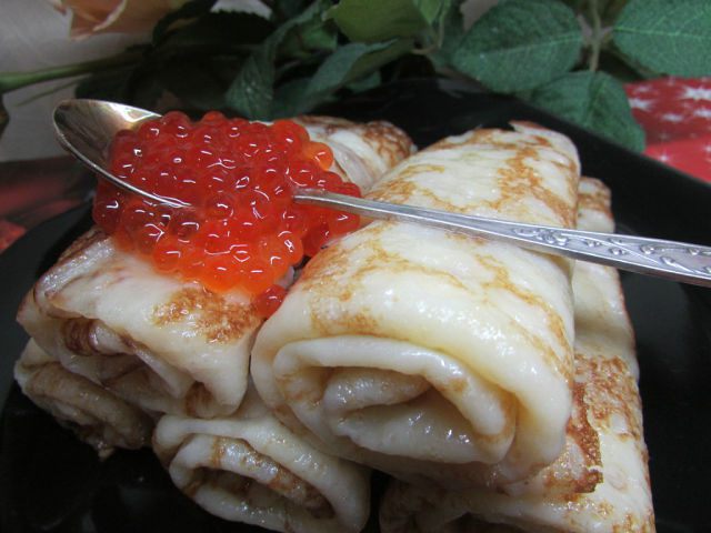 Холодные блины можно порезать как лапшу и есть с молоком, горячие с маслом, а можно и с икрой.