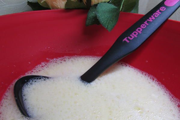 Разбавить оставшимся молоком. Размешать тесто до однородной консистенции (без комком).