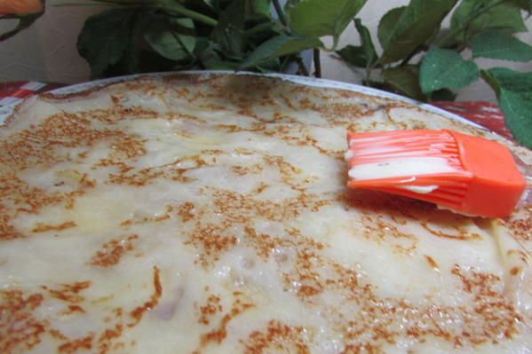 Каждый блин смазать сливочным маслом. С этой порции получается 8-9 блинов.