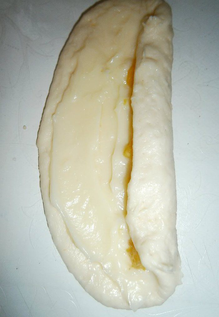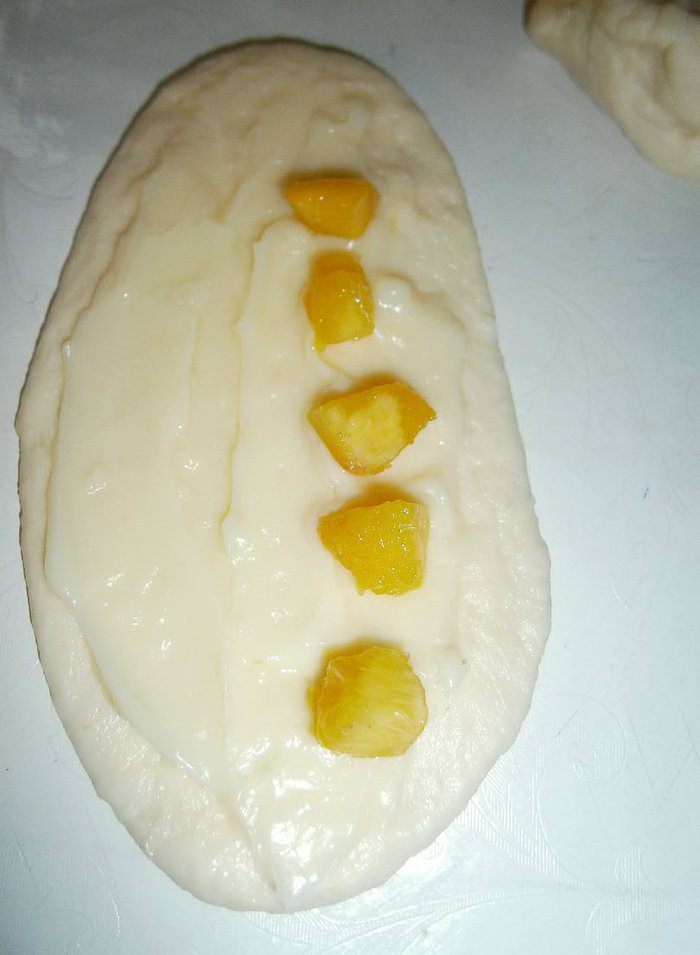 Каждую часть теста раскатать в форме язычка, смазать кремом ( оставить немного крема для украшения ~ 4 ст. л.), выложить кусочки персика..