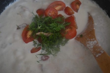 Добавить рыбу и черри, разрезанные на половинки, укроп и томить еще около 10 минут.