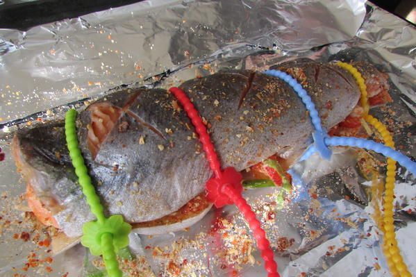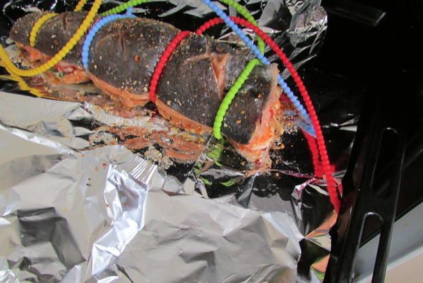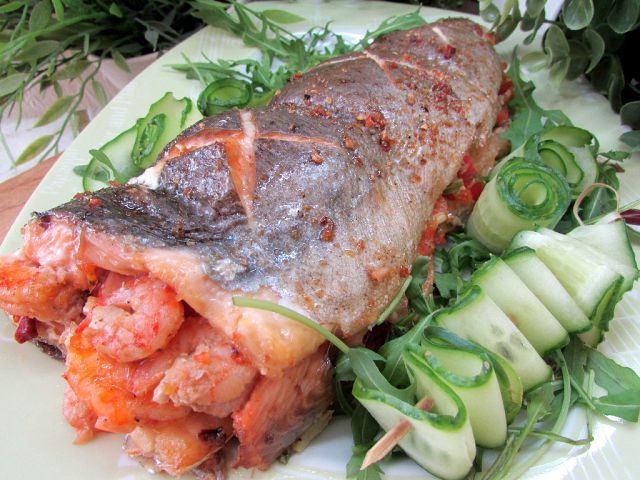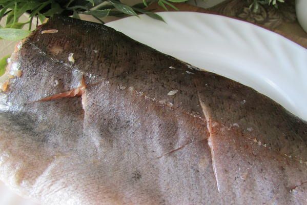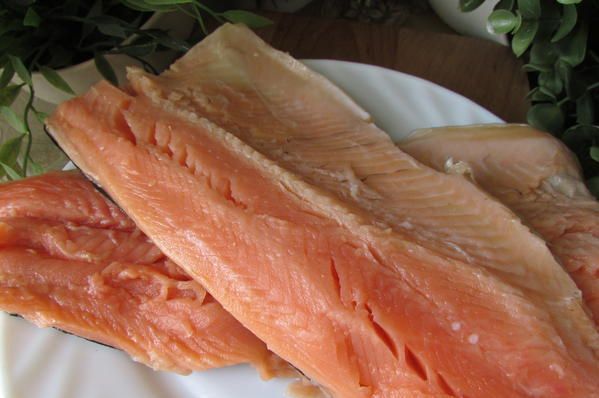 Лосося очистите, выпотрошите и тщательно промойте. Сделайте глубокий надрез вдоль хребта, немного раздвиньте мякоть и, делая небольшие подрезы вдоль рёбер, разделите рыбу на 2 половины. Удалите хребет вместе с хвостом, а также плавники, рёберные кости и мелкие косточки.