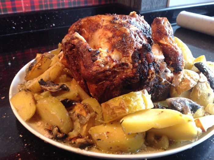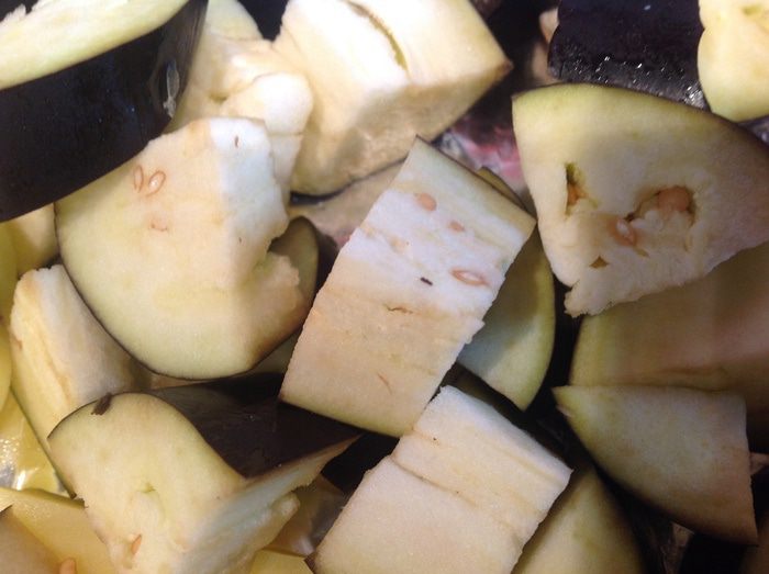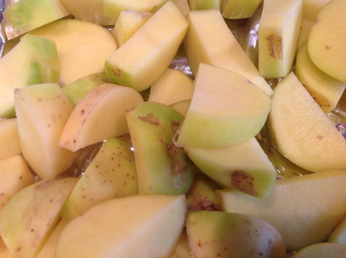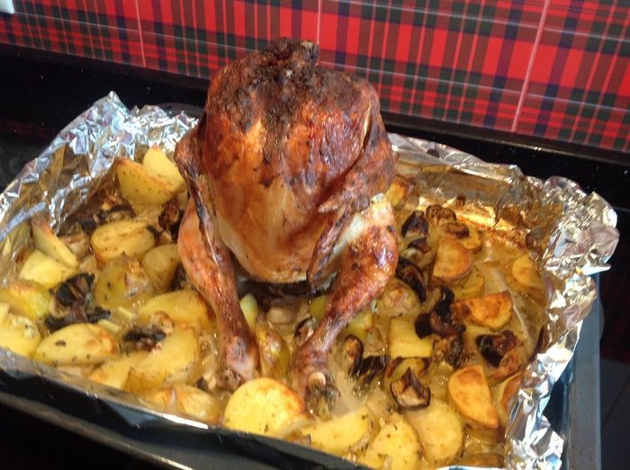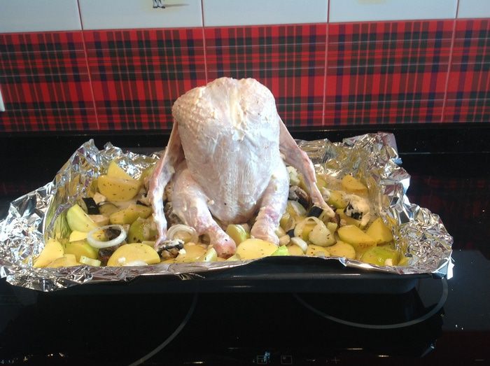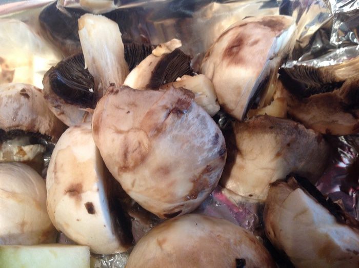 Овощи выложите на противень застеленный фольгой и смазанный маслом, сбрызните соком лимона, посолите, приправьте перцем и тимьяном. Посередине противня поставьте бутылку наполненную водой (подойдет бутылка из под пива или детского сока, как у меня, главное, чтобы она вошла в духовку).