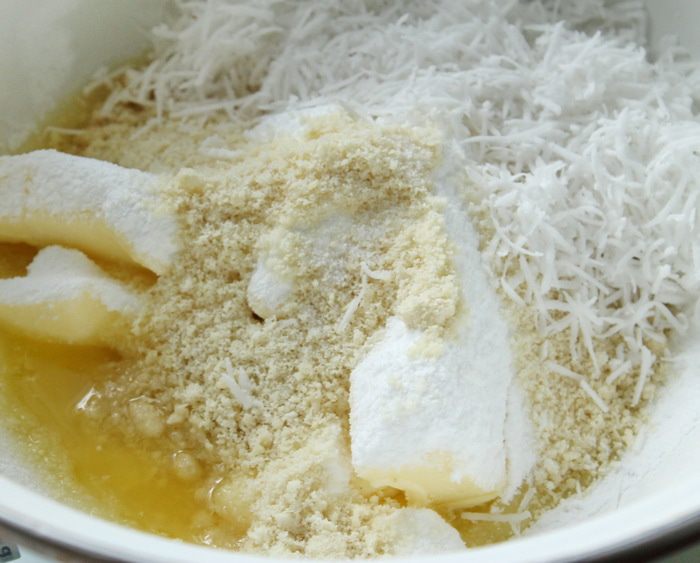 Взбить сливочное масло с сахарной пудрой, молотым миндалем, кокосовой стружкой и солью.