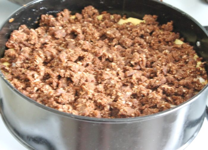 Все ингредиенты для крошки смешать и растереть пальцами, так чтобы получилась крошка. Покрыть крошкой кокосовую начинку.