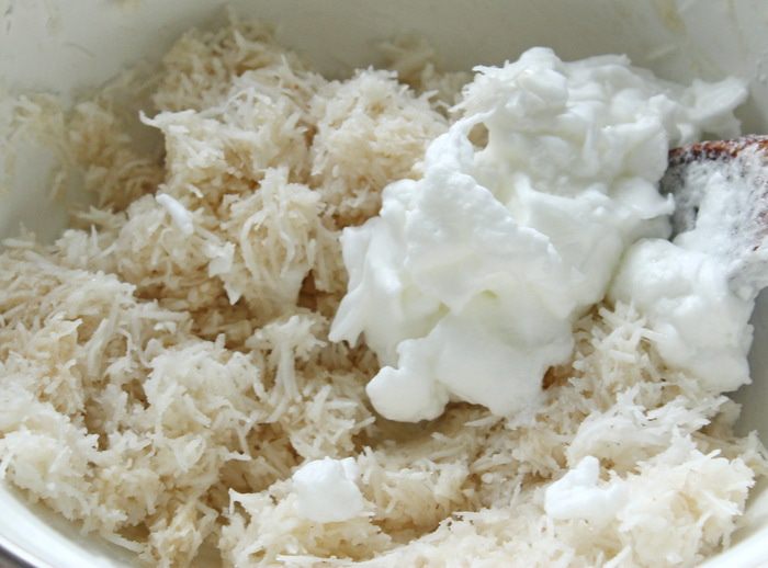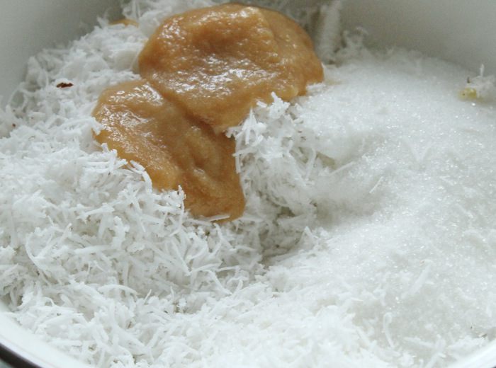 Для начинки смешать кокосовую стружку, сахар и яблочное пюре (я использовала остатки детского питания).