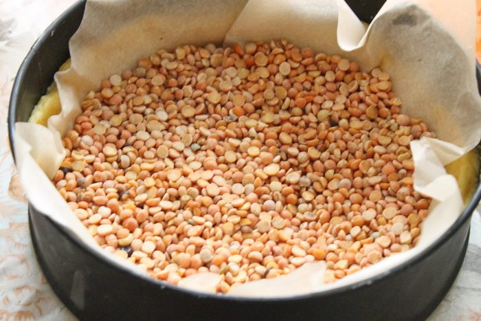 Выпекать в разогретой до 180 градусов духовке примерно 10 минут с грузом (у меня горох) и 8 минут без груза. Достать корж из духового шкафа и охладить.